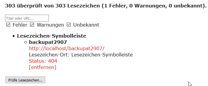 ZitatDie Überprüfung der Lesezeichen kann bis zu mehrere Minuten dauern und hängt sowohl von der Anzahl der Lesezeichen als auch von der Internetgeschwindigkeit ab.