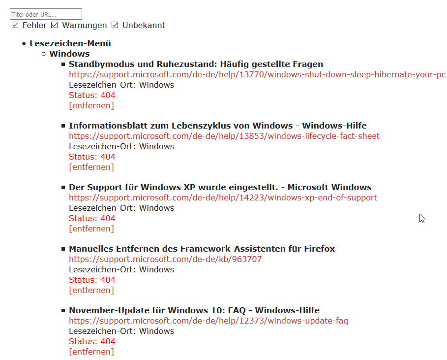 Die Erweiterung scheint etwas gegen die Seite https://support.microsoft.com/de-de/help/ zu haben. Jedenfalls werden funktionierende Links als Status: 404 gemeldet.