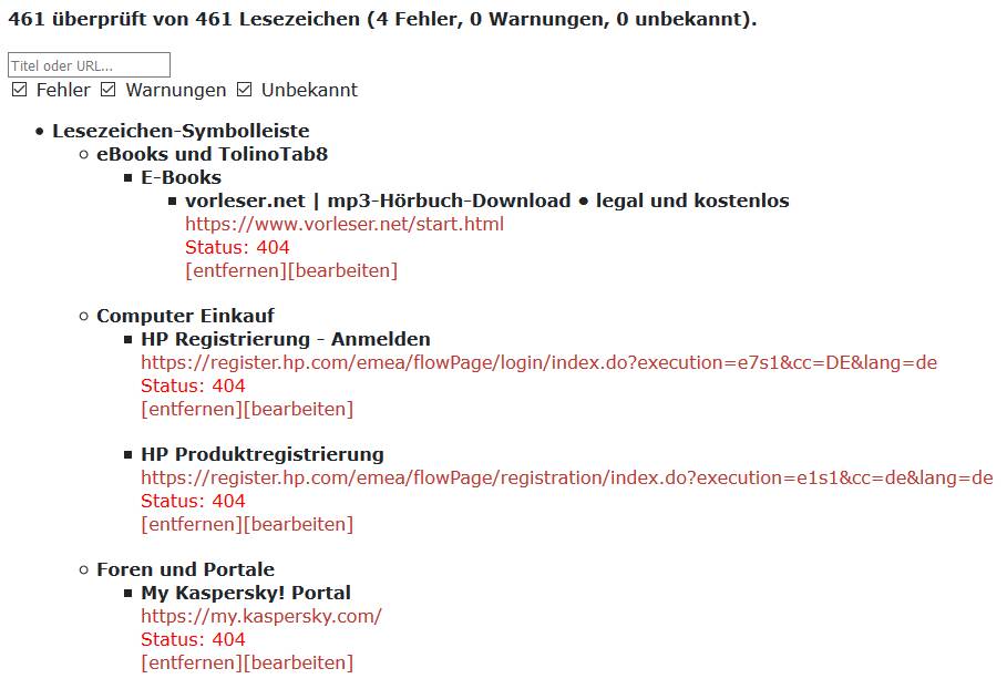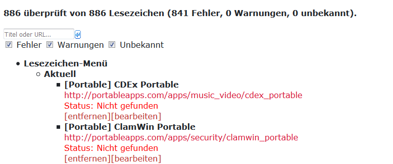 Von 886 Lesezeichen werden 841 nicht gefunden