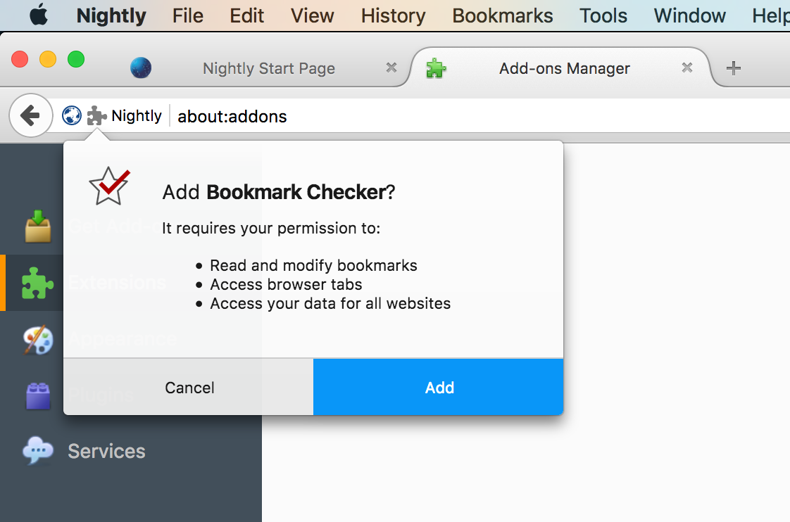 Anbei übrigens ein Screenshot von der Installation, welcher das kommende Berechtigungssystem für WebExtensions in Firefox 53 am Beispiel dieser Erweiterung zeigt. Das ist extrem cool. In der WebExtension-Welt müssen für bestimmte Dinge Berechtigungen in das Manifest eingetragen werden. Auf diese Weise können Nutzer nicht überrascht werden. Fordert eine Erweiterung beispielsweise keine Berechtigung zum Bearbeiten von Lesezeichen an, kann eine Erweiterung diese auch nicht heimlich löschen. Das ist einer der Gründe, wieso ich WebExtensions klasse finde.