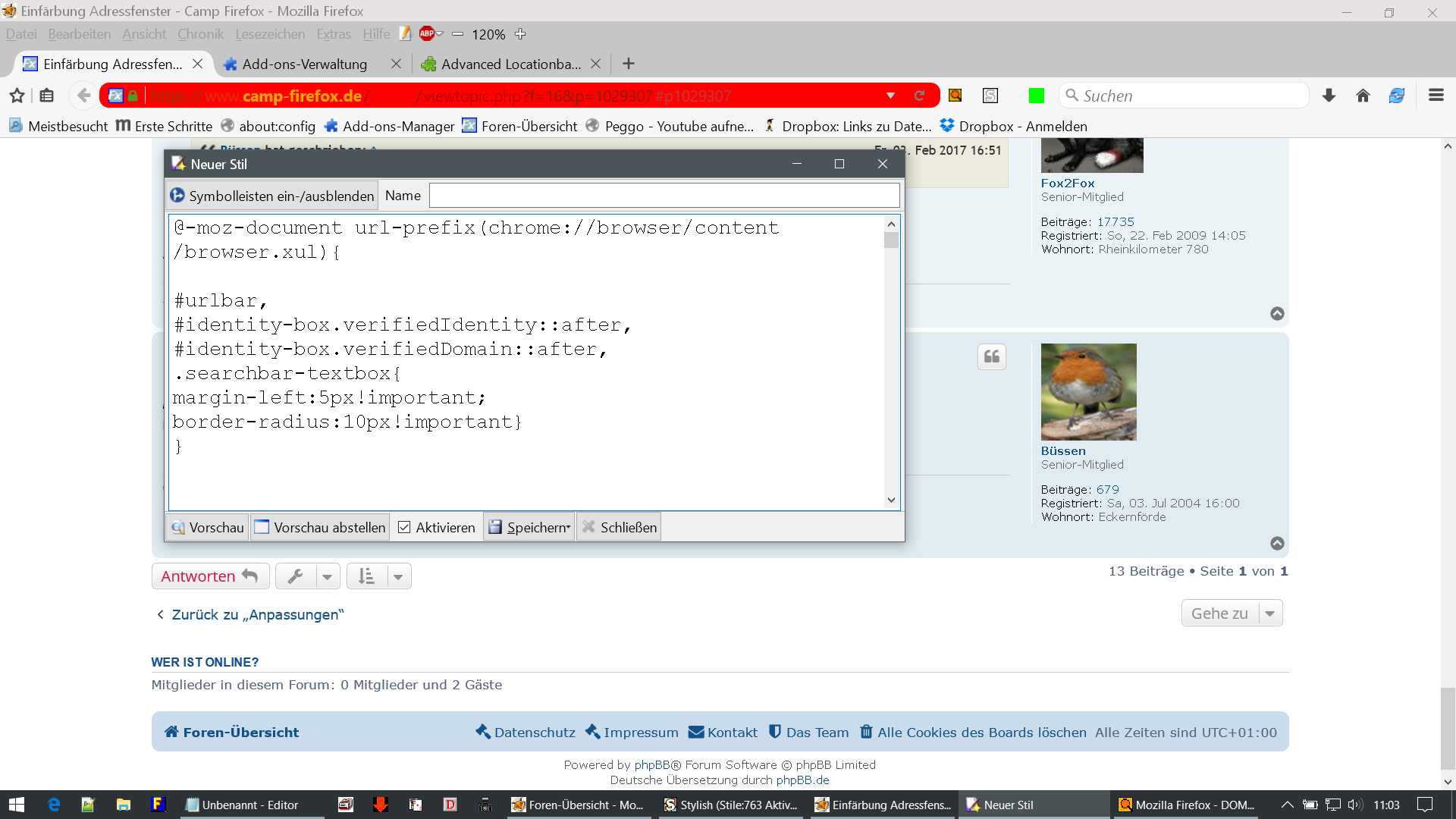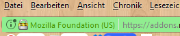 Für die Adressleiste habe ich jetzt weder code noch Erweiterung in Verwendung. Lediglich der Haken bei "Farbig bei verif. ..." im Classic Theme Restorer ist angeklickt. Für die komplette Umfärbung habe ich deinen Code aus dem Beitrag