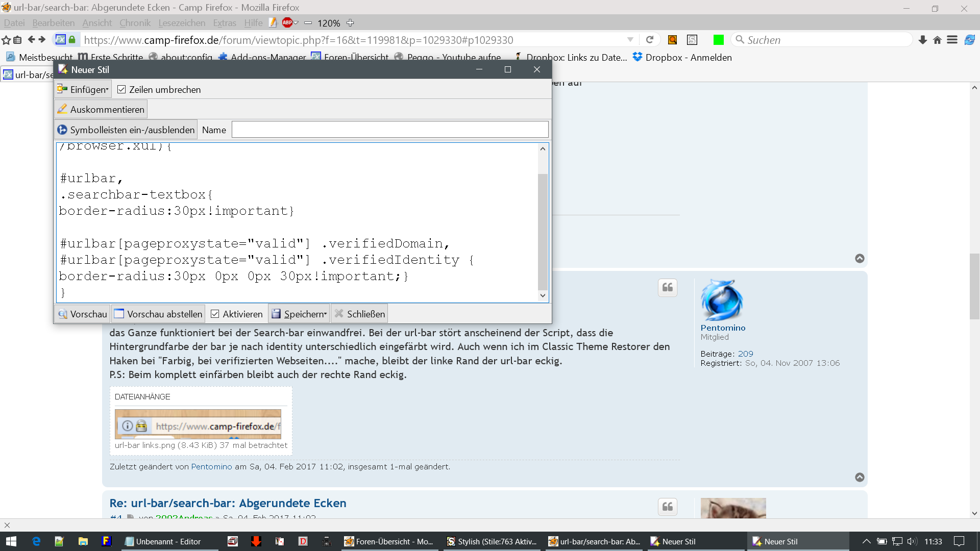 das Ganze funktioniert bei der Search-bar einwandfrei. Bei der url-bar stört anscheinend der Script, dass die Hintergrundfarbe der bar je nach identity unterschiedlich eingefärbt wird. Auch wenn ich im Classic Theme Restorer den Haken bei "Farbig, bei verifizierten Webseiten...." mache, bleibt der linke Rand der url-bar eckig.