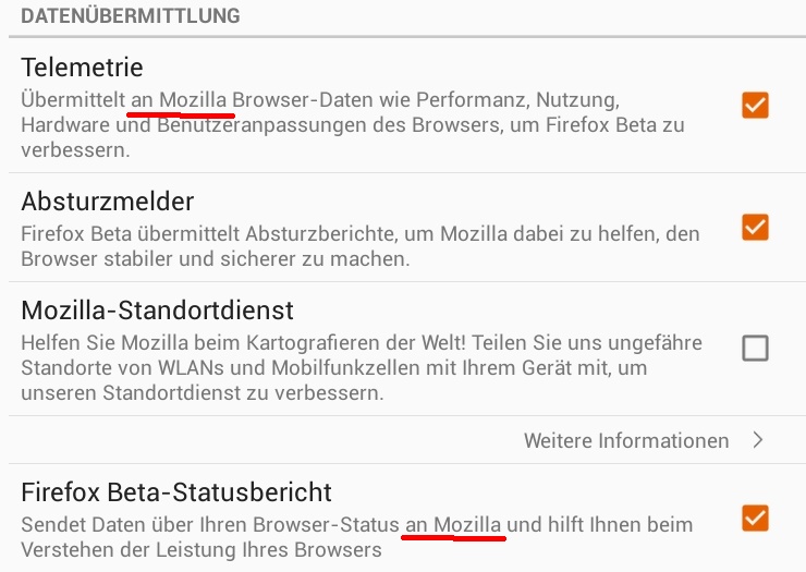 Es gibt keinen einzigen Nutzer dieser App, der dem nicht zugestimmt hat, siehe Absatz oben. Mozilla macht nichts, was nicht durch die Datenschutzbetimmungen abgedeckt ist. Und vor allem geht es hier um nichts, was in irgendeiner Weise persönliche Daten des Nutzers wären, also bleiben wir mal auf dem Teppich.