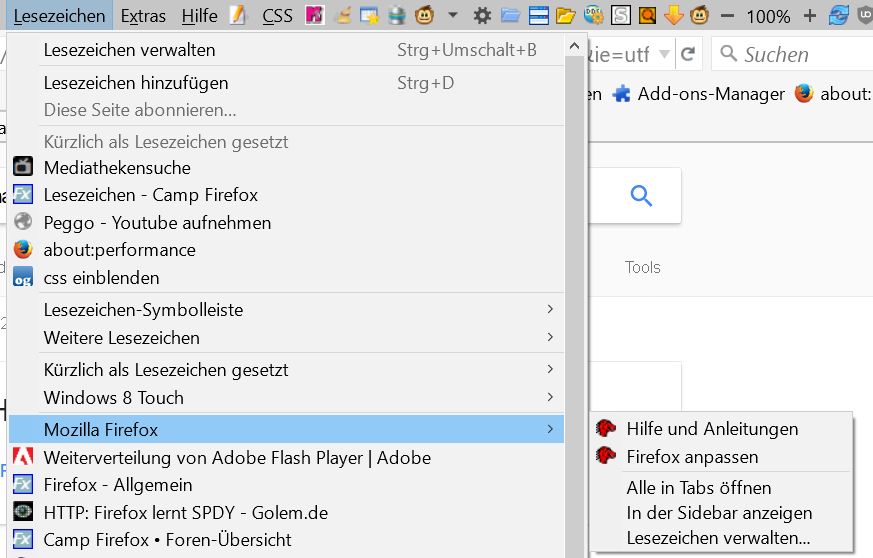 Leider musste ich über die folgenden Wochen und Monate feststellen, dass ich doch ein wenig voreilig gehandelt hab. Ich hab ein sehr langes Bookmarkmenü, in dem ich (fast) nur Verzeichnisse habe. Wenn ich jetzt die Maus über einen Verzeichniseintrag positioniere, so klappt das Untermenü auf und verdeckt den Scrollbalken. Das Navigieren wird echt zum Geduldspiel.