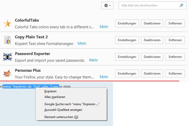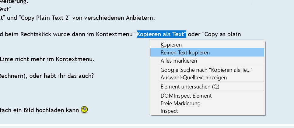 Damals wählte ich den Text aus und beim Rechtsklick wurde dann im Kontextmenu "Kopieren als Text" oder "Copy as plain text" angeboten.
