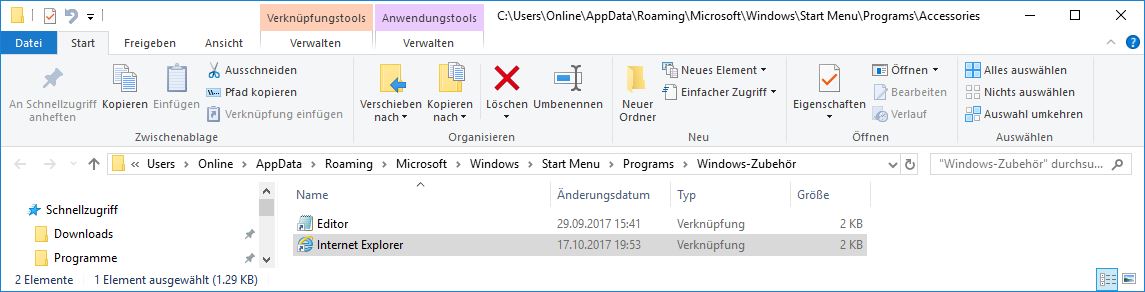 Danke, aber genau dort ist auch bei mir die Verknüpfung, sieht also genauso aus wie auf deinem Screenshot. Aber trotzdem wird der IE nicht gefunden, wenn ich via Windowstaste den Suchbegriff Internet eingebe :-??? Der Editor hingegen wird problemlos gefunden.
