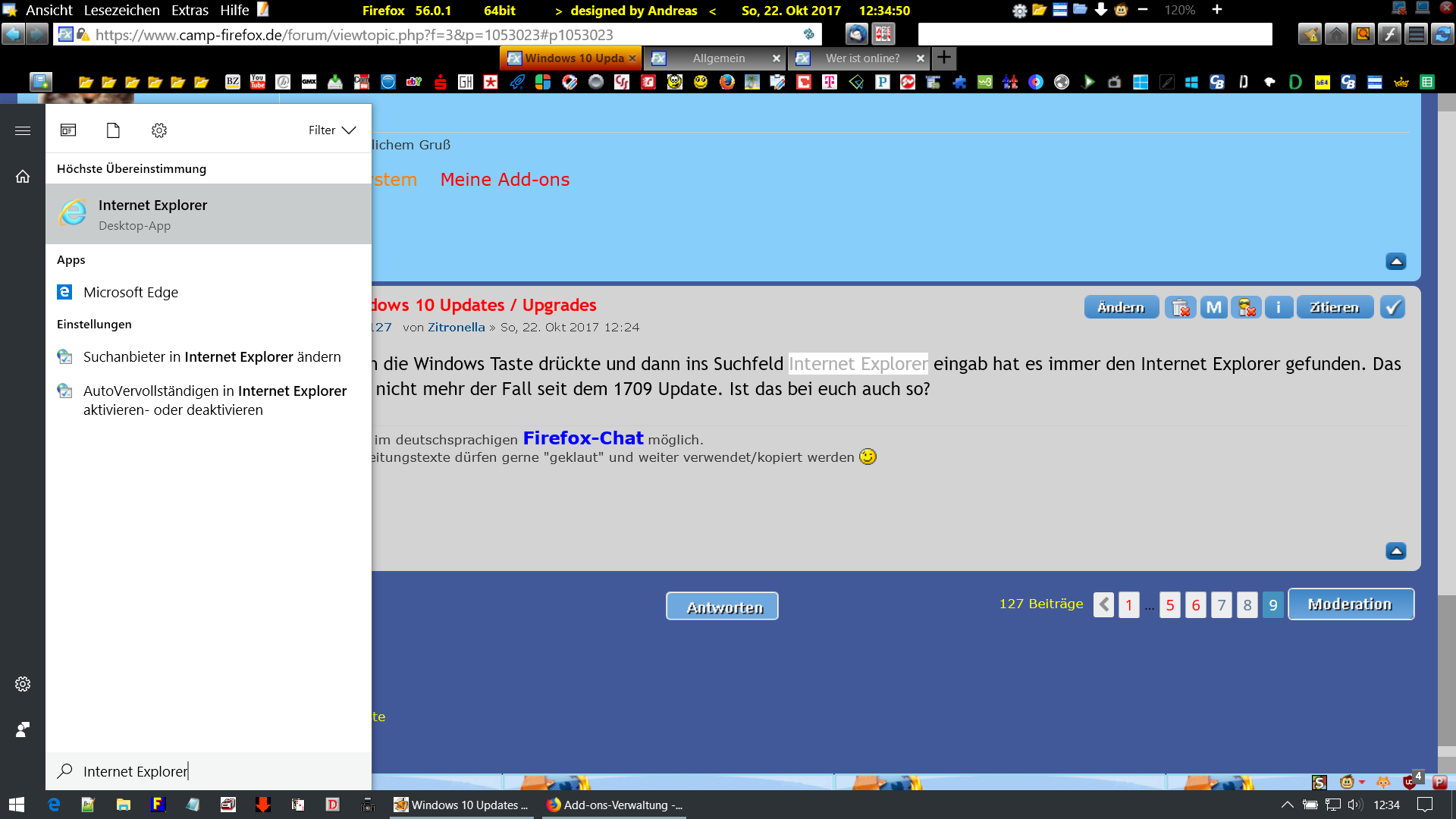 • Wenn ich die Windows Taste drückte und dann ins Suchfeld Internet Explorer eingab hat es immer den Internet Explorer gefunden. Das ist jetzt nicht mehr der Fall seit dem 1709 Update. Ist das bei euch auch so?