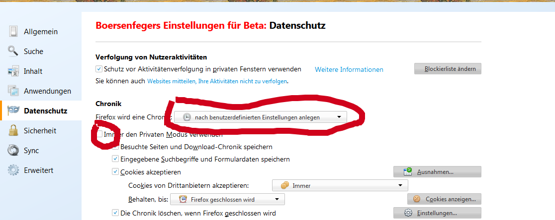 Ein Rückgriff auf eine alte, nicht mehr sichere Version ist der falsche Schritt.. Tippe oder kopiere about:preferences#privacy in die Adressleiste und schaue nach, ob eine Chronik angelegt wird... oder ob sich ein Kreuz bei Immer den Privaten Modus verwenden befindet... [attachment=0]Screenshot - Apr 13, 2017 2.36 PM.png[/attachment] falls ja, entferne dies bzw wähle oben aus, das eine benutzerdefinierte Chronik angelegt wird. Danach musst du ggf. die Sitzungswiederherstellung in TMP deaktivieren, was zu empfehlen ist, da die TMP-Wiederherstellung fehlerbehaftet sein kann.