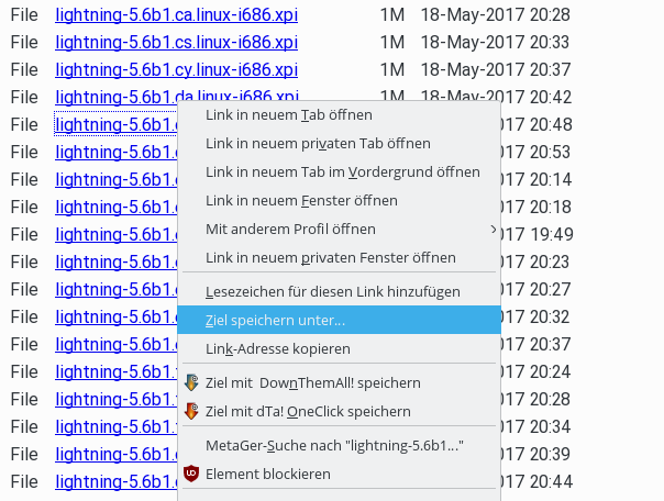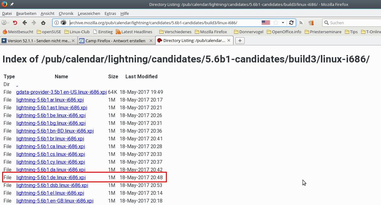• Seit knappen drei Jahren habe ich openSUSE als OS; hier laufen die aktuelle Vs. von Firefox und auch der Thunderbird stabile Version 52.1.1 - mit Lightning. Bis Dato hatte ich keinerlei Probleme, nach einer Aktualisierung des Thunderbird auch Lightning neu einzuspielen, bzw. zu installieren. Wenn nach einem update der Thunderbird, oder auch Lightning, mal in englischer Sprache war, dann habe ich deinstalliert und nochmals erneut installiert. Dann war alles korrekt, und auch in Deutsch. Es werden bei Lightning sehr oft Fehlermeldungen angezeigt, was den Thunderbird betrifft; wenn man das übersieht, oder es noch mal neu installiert, dann geht alles.