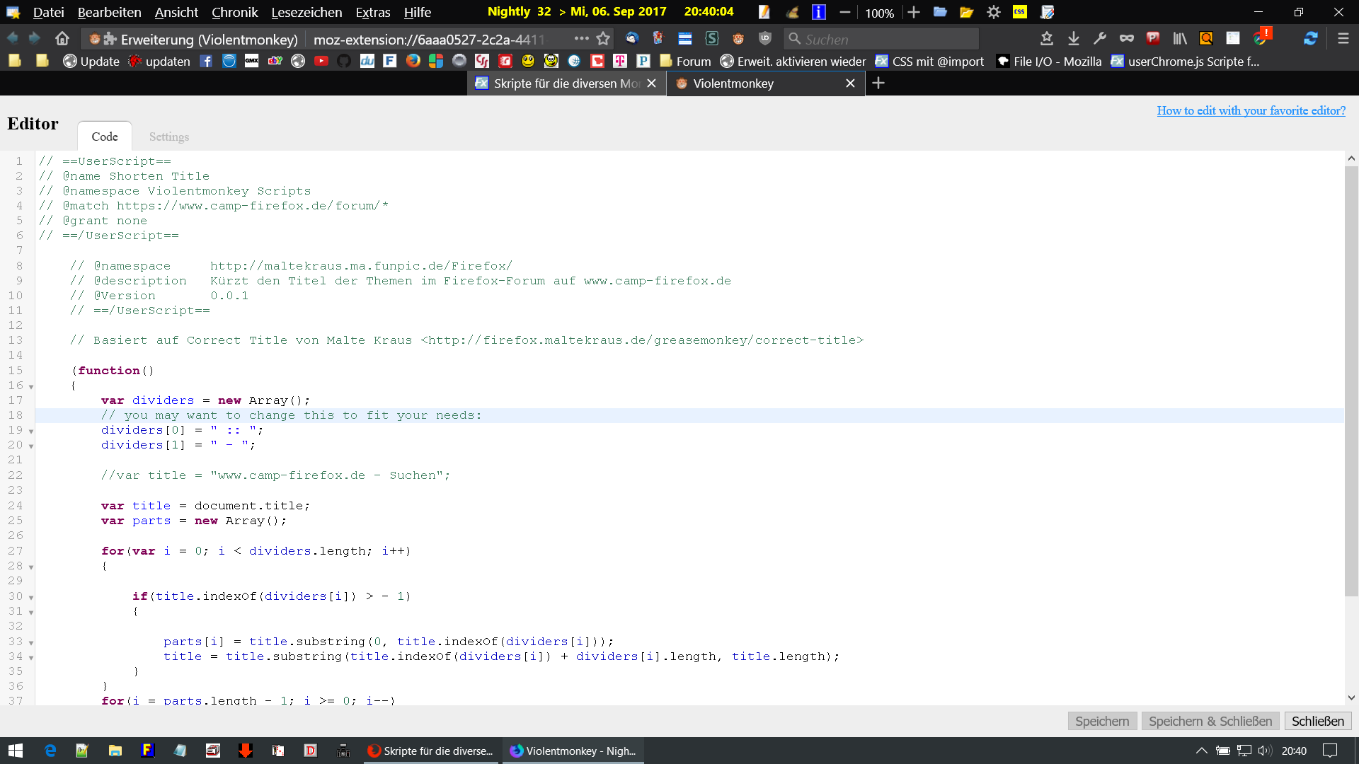 Verstehe ich da etwas falsch? In einem neuen Profil ohne Erweiterungen oder Scripte wird mir der Titel angezeigt (Nightly 57.0a1 (2017-09-06) (64-Bit)).