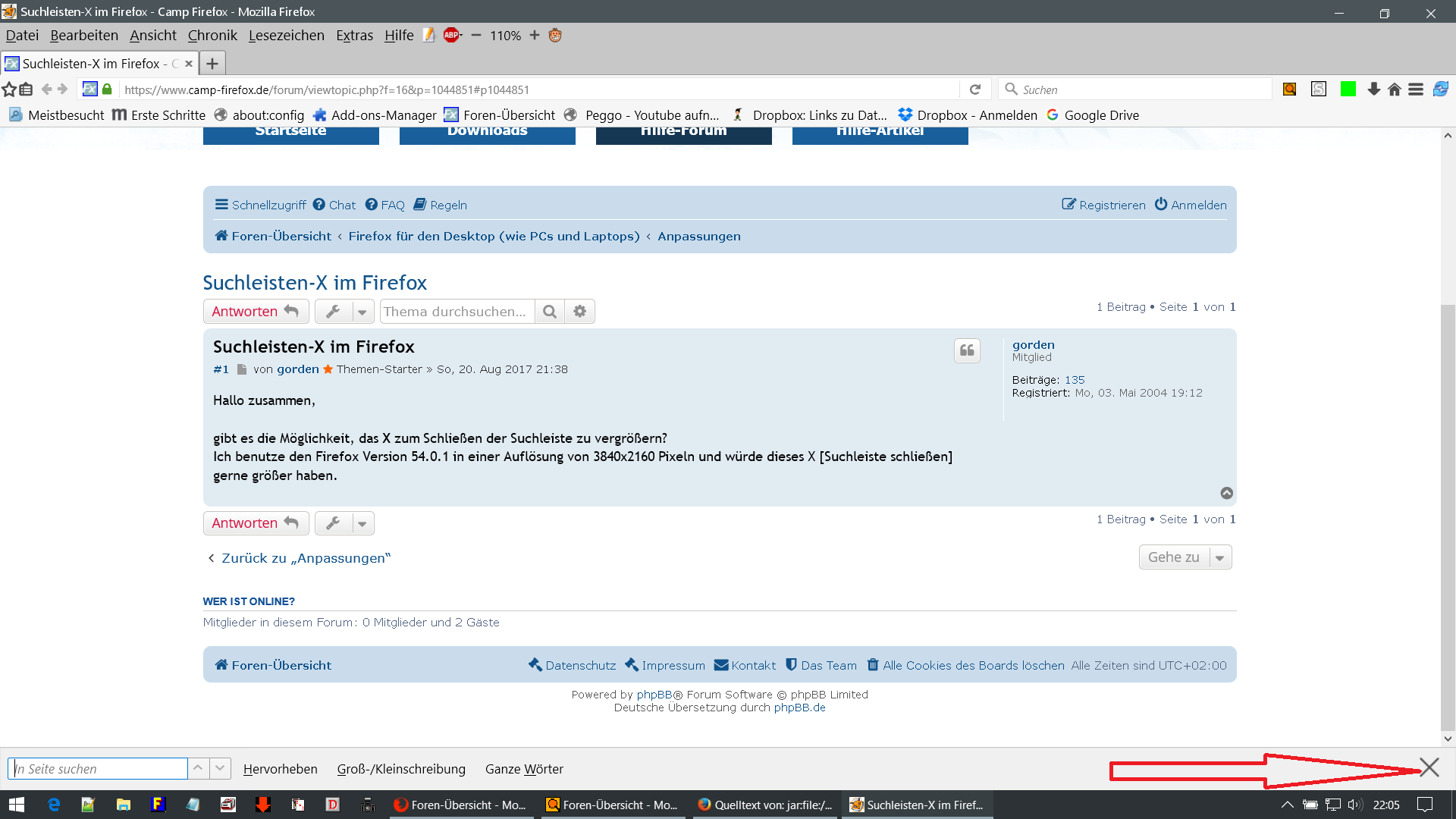 Ich benutze den Firefox Version 54.0.1 in einer Auflösung von 3840x2160 Pixeln und würde dieses X [Suchleiste schließen] gerne größer haben.
