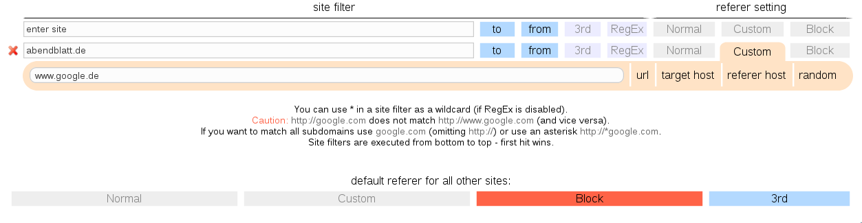 Jetzt bin ich bei Referer Control gelandet, das glaub ich auch Zitronella (?) benützt. Davon werde ich vorläufig erst mal nur die einfachen Einstellungen benützen, also ja/nein. Getestet habe übrigens erst erst nur kurz. Mit den einfachen Einstellungen im unteren Bereich der Settings.