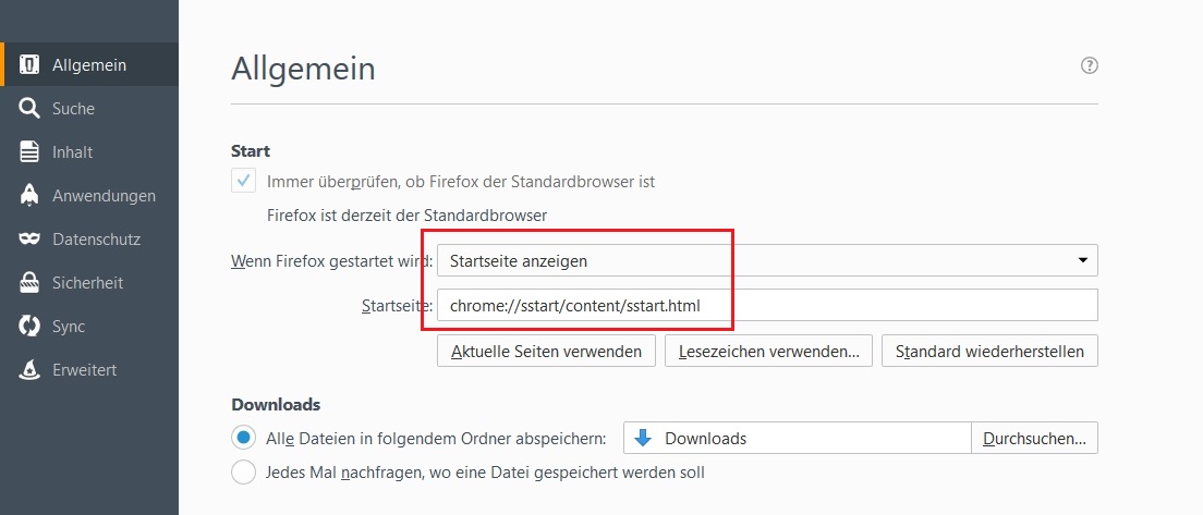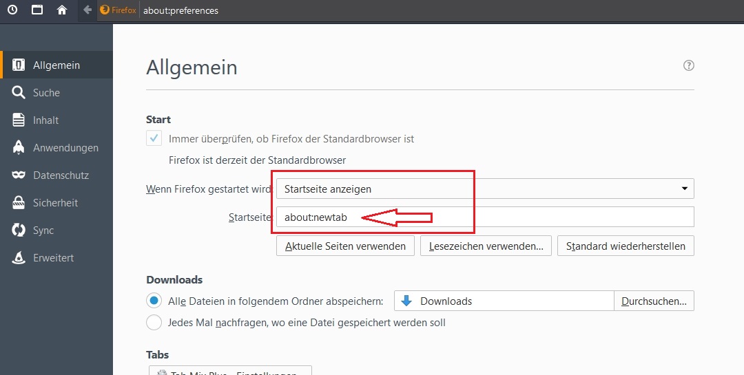 wegen Anpassen der der Startseite schau hier einmal https://support.mozilla.org/de/kb/neuer-ta…ten-von-kacheln