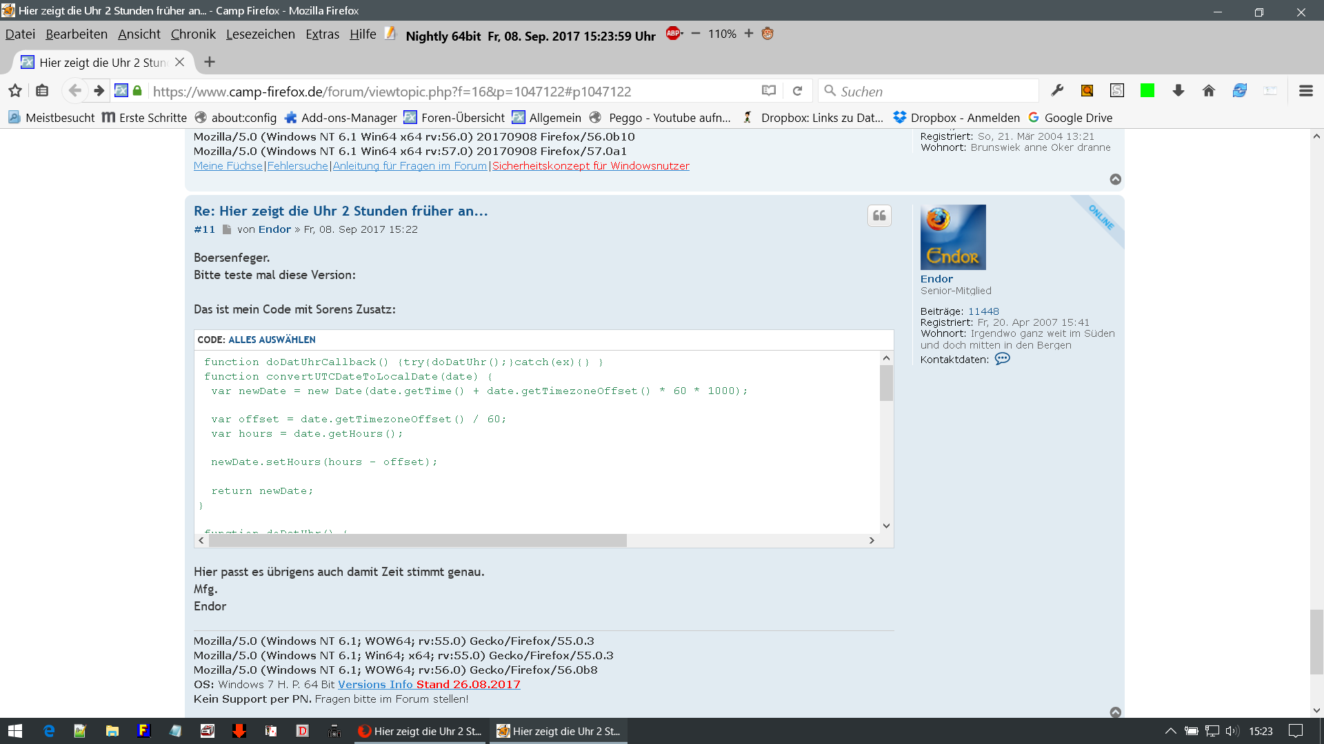 • Unter Firefox 57.* nutze ich das Script von Endor, das mir Datum und Uhr in der der Nav-Bar anzeigt... seit heute bin ich jedoch 2 Stunden zu spät: :shock: