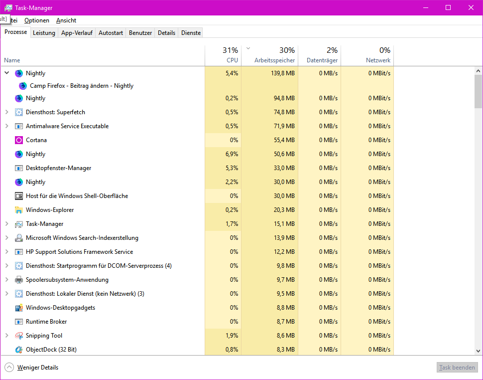 Stand heute - die Firefox-Instanzen laufen angenehm flott. Ich habe zwischenzeitlich einmal alle Instanzen neu gestartet. Nicht weil die Firefox-Instanzen sich aufgehängt haben, sondern weil ich die Reihenfolge der Anwendungen in der Taskleiste ändern wollte.