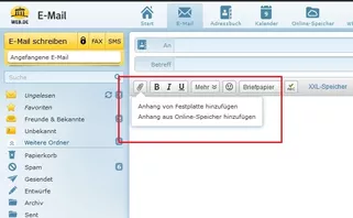 • Ist das Mail-Format in Web.de auf Text oder Design gestellt? Falls bereits Design-Mail aktiviert ist, versuch mal das Bild über das entsprechende Icon in der Leiste einzufügen. Falls es nicht angezeigt wird, müsstest du es unter dem Icon "Mehr" finden.
