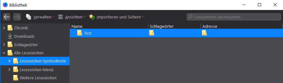 Der oben zitierte Code funktioniert, besitzt jedoch beim benutzen einige Tücken. Zum einen fällt auf das unter "Lesezeichen verwalten" plötzlich unter den Spalten "Schlagwörter" und "Adresse" Ordnericons angezeigt werden (beim anzeigen von Ordnern), was eigentlich nicht gewollt sein sollte. (➜ siehe Screenshot unten)