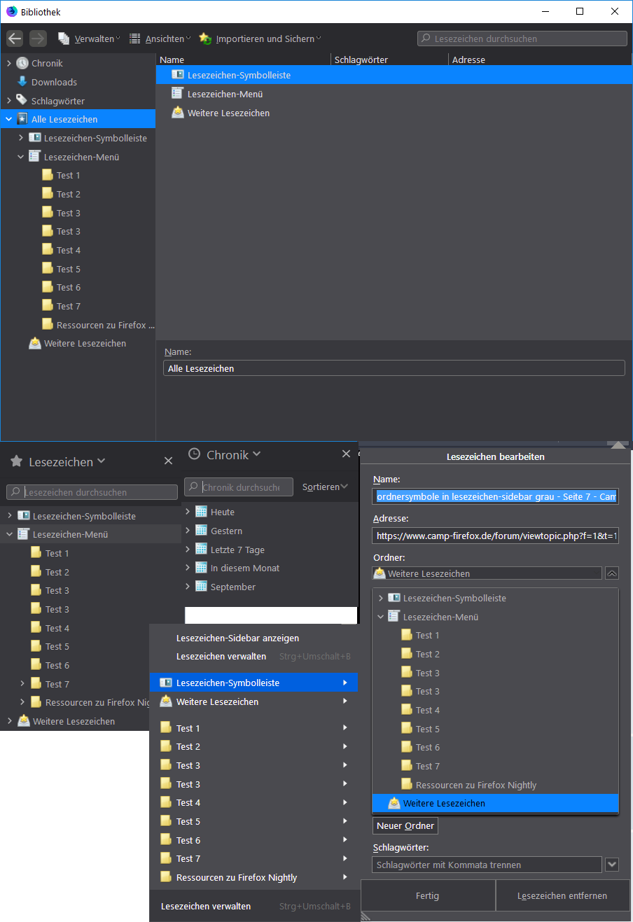 ➜ Hier also mein CSS-Code, welcher (fast) jedes Ordnericon (im Lesezeichenmenü/Lesezeichensidebar/Chronik/"Lesezeichen verwalten"/"Leszeichen hinzufügen/bearbeiten") mit einem Icon aus älteren Firefox-Versionen ersetzt.