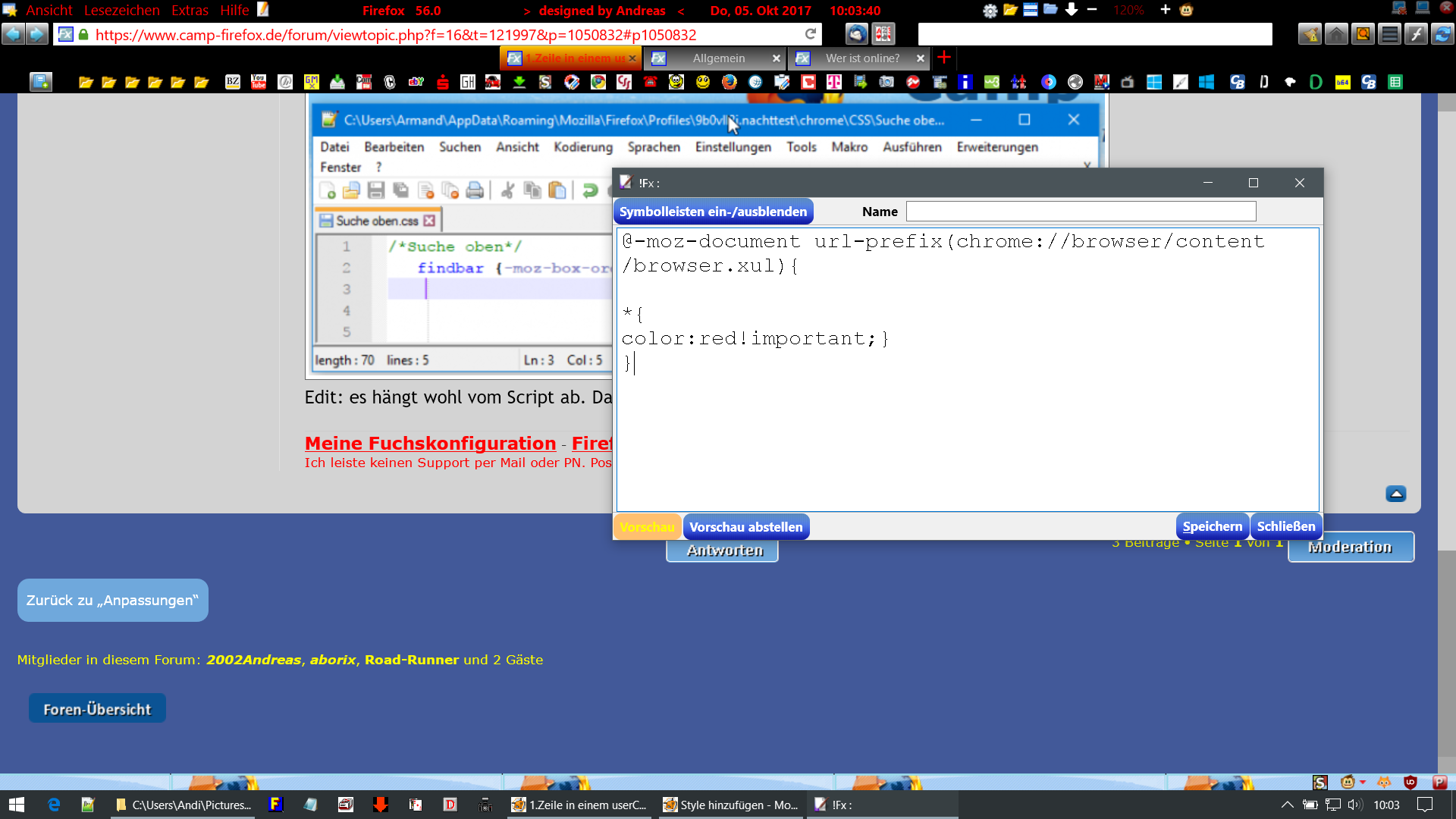 Ich habe nur eine userStyle.css damit ich nicht jede Änderung 3 mal machen muß und dann logische Links zu den verschiedenen Profilordnern. Deshalb wirkt der Code bei mir auf verschiedenen Versionen.