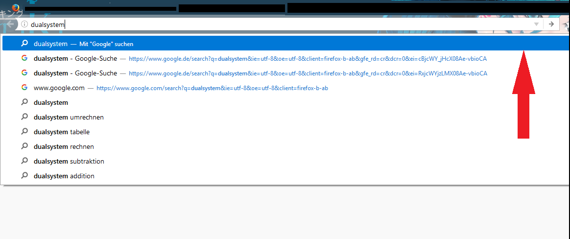 • Diese Leiste ist eigentlich gar keine, sondern die Markierung des ersten Eintrags der Suchvorschläge. Klick mal probeweise mit der rechten Maustaste auf einen Vorschlag weiter unten in der Liste. Du wirst sehen, dass dann dieser Vorschlag blau unterlegt ist.