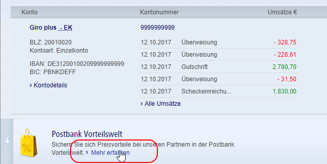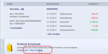 Bei der Postbank in der Kontenübersicht gibt es am unteren Rand einen Einblendbereich, der aber "im Hinterrund" erscheint und somit sind Links darin nicht anklickbar...