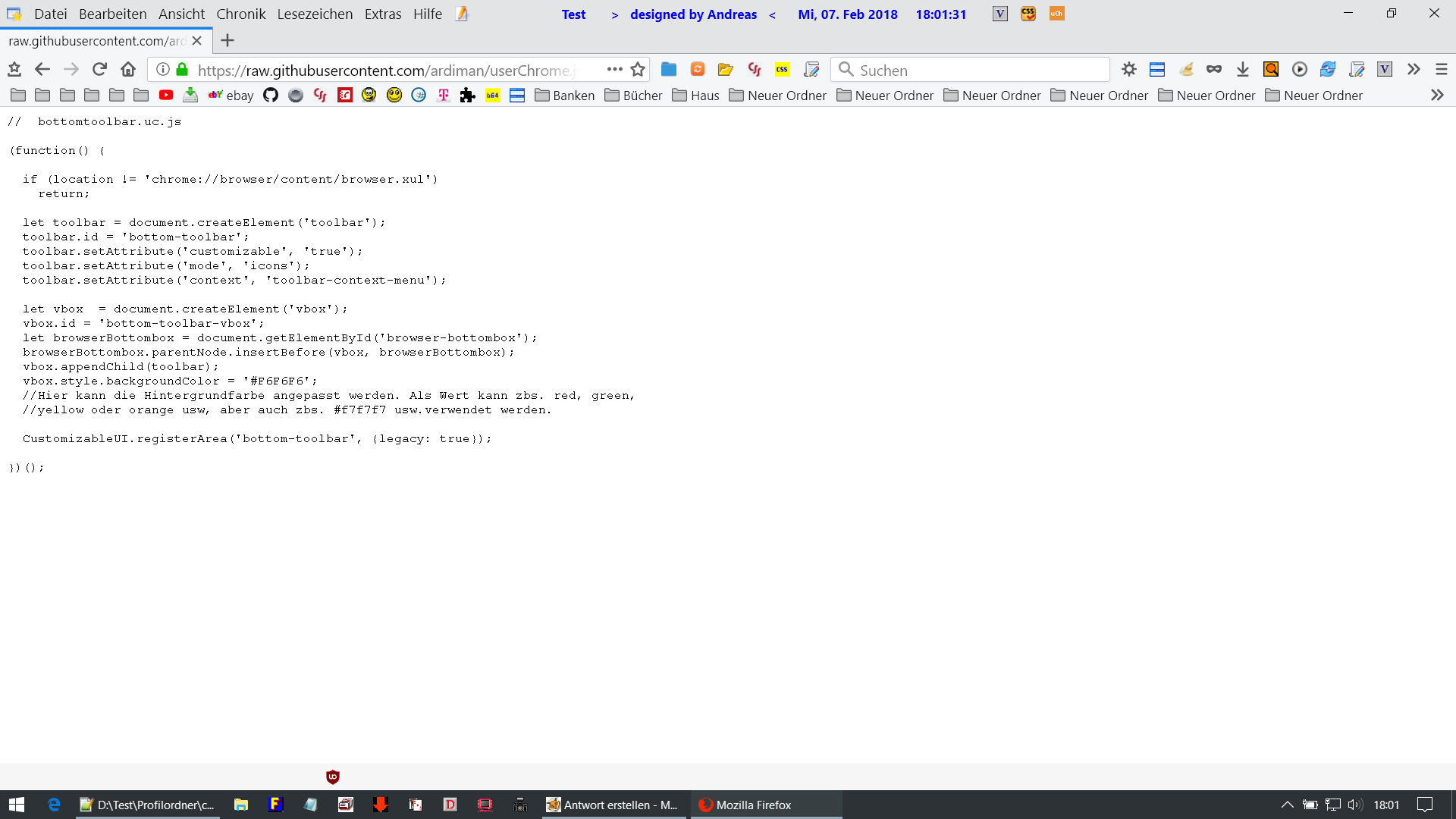 • Wie ich festgestellt habe, gibt es anscheinend keinen Grund (mehr), das Statuszeilen-Script mit einem bestimmten Namen zu belegen. Das hatte ich bereits bemerkt, als ich mein Tool gescriptet habe. Ich habe es auch eben nochmals getestet. Sowohl im FF 58 als auch im FF 59 kann ich das Script so benennen, dass es alphabetisch an letzter Stelle im chrome-Ordner steht und es wird trotzdem korrekt eingebunden. :)