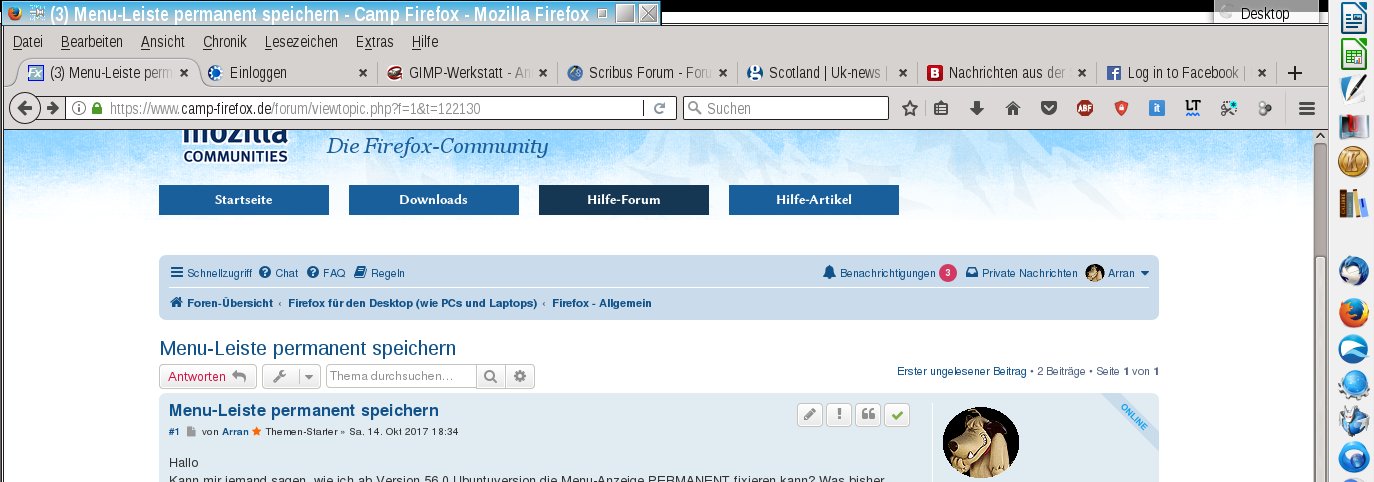 Kann mir jemand sagen, wie ich ab Version 56.0 Ubuntuversion die Menu-Anzeige PERMANENT fixieren kann? Was bisher einfach war, einmal einstellen und Gut ist, ist nun verschwunden.