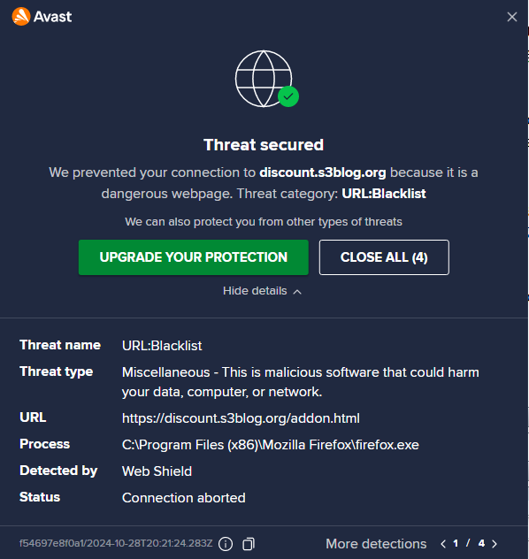 Es wäre interessant, was bei Avast unter "See Details" zu sehen ist, das bitte mal aufklappen und ablichten. Vielleicht kommt das ja gar nicht mehr von Firefox.