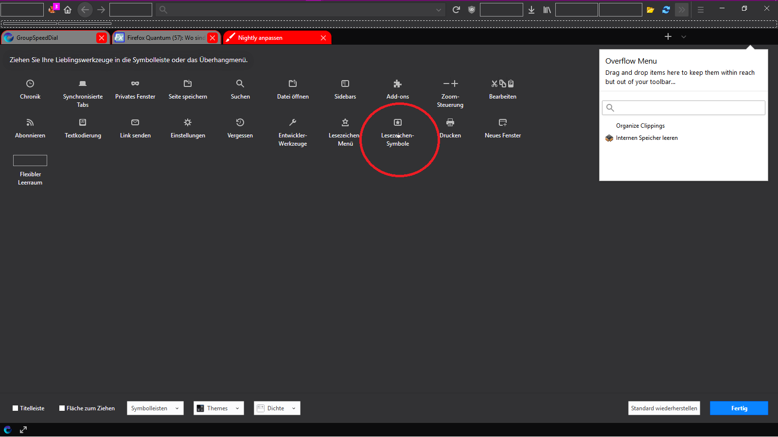 Wenn du die Lesezeichensymbolleiste meinst, dann musst du dir die ggf. im Anpassen-Dialog wieder per "Lesezeichen-Symbole" wieder an die von dir gewünschte Stelle ziehen.