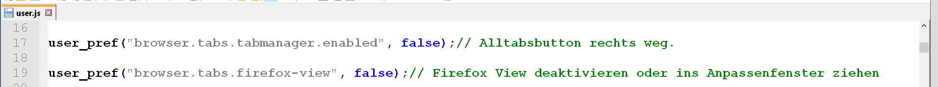 Ich bin ja ein Fan von TabMix Plus da man die Tabs gut einstellen kann und so das verhalten wie es in Chrome oder Edge gemacht wird gut nachmachen kann. Allerdings mit der normalen config.js bekomme ich TabMix Plus nun nicht mehr zu laufen. Mit einer config.js aus dem TabMix Plus Git würde es aber wieder gehen, Nun wurde mir ja unter anderem vom 2002Andreas und auch anderen geraten das ich alles so verwenden soll wie die meisten User hier auch. Daher welche möglichkeit habe ich jetzt noch das ich TabMix Plus wieder verwenden kann?