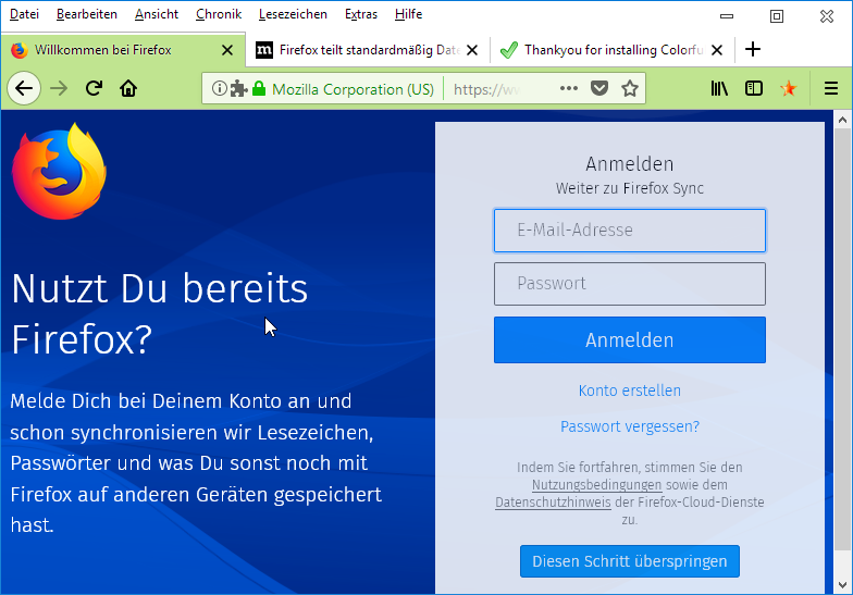 • Es ist wirklich wichtig, dass ColorfulTabs in ein frisches Profil installiert werden sollte. All die die sich auf AMO über dieses problem beschwert haben, hätten mal diesen Hinweis lesen sollen. Hier ist ein Screenshot aus meinem frischen Profil: