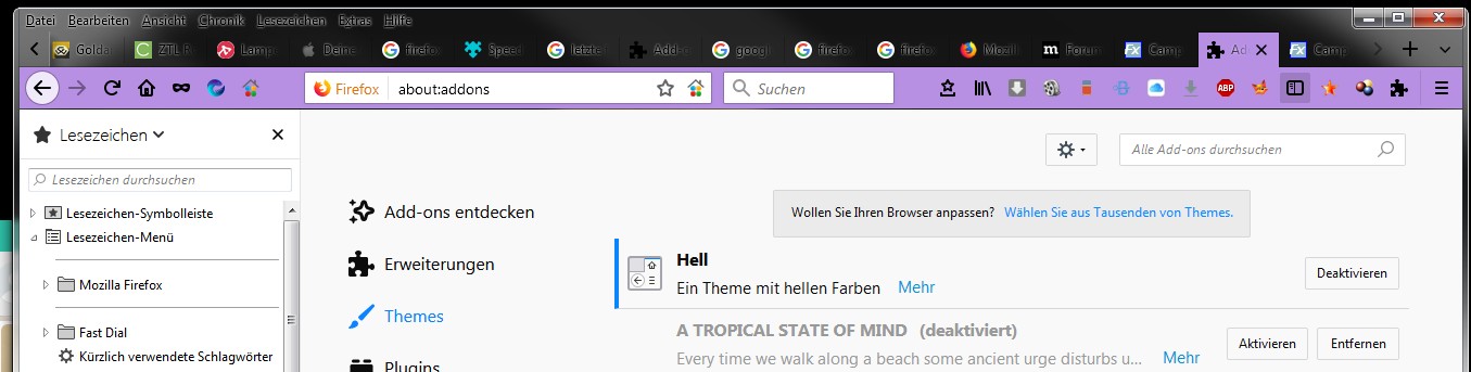 Zuerst dachte ich es ist ein Einstellungsproblem, aber ich habe bereits unter:Addons-Themen-"Hell" ausgewählt. Sobald ich allerdings irgend einen anderen Reiter anklicke wird im Menü und Reiter-Bereich leider wieder Alles schwarz.