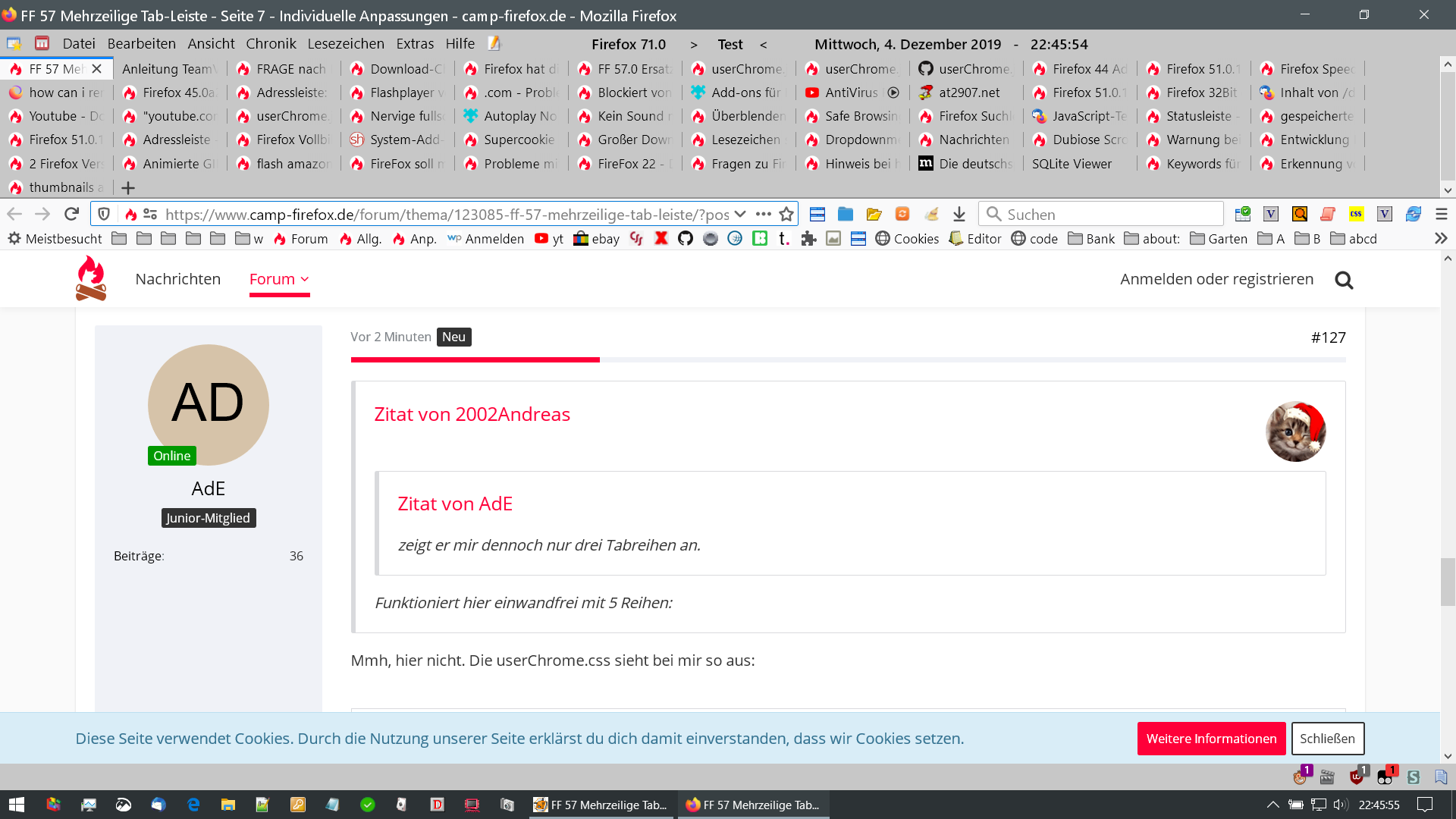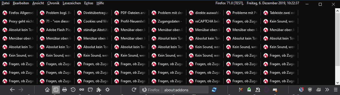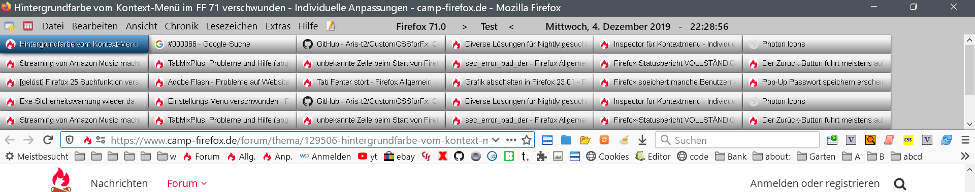 Alternativ kann ich diesen angepassten CSS/JS-Code für FF71+ anbieten. Der ist für die normale Symbolleisten-Reihenfolge geeignet. Wem die optischen Anpassungen in dem CSS-Code nicht gefallen, kann diese ändern oder auch ganz löschen. Benötigt wird aber auf jeden Fall alles, was dort unter /* Mehrzeilige Tabreihen */ steht!