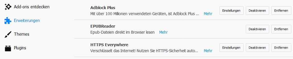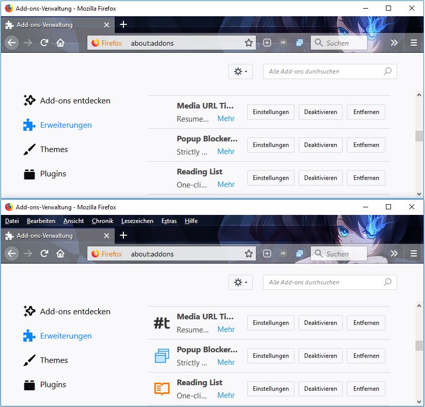 Hier mit Firefox Programme Portable durch Umbenennen des Dateiordners (Firefox) sind die Icons in Add-ons/Erweiterungen auch verschwunden! Beheben kann ich es indem ich den Programmordner firefox lösche und durch eine neue firefox ersetze.