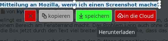 Was mir noch aufgefallen ist: Wenn man nichts auswählt sondern nur die Eingabetaste drückt, dann geht es auch ab in die Cloud. Als ich das Bild mit einem externen Programm (vom Betriebssystem) gemacht habe, hat FF die Eingabetaste (die an sich nur für mein Screenshotprogramm als Auslöser notwendig war) auch registriert und - ab in die Cloud... aber natürlich nur das markierte, ohne die Bedienungselemente...