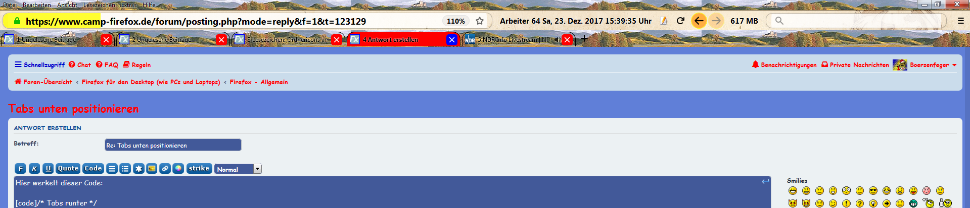 ich klicke mit rechter Maustaste rechts oben auf die 3 waagerechten Striche (Menue öffnen), dort auf Anpassen und kann nun die Zeilen nach Belieben verschieben, wenn ich sie mit gedrückter linker Maustaste ziehe. Abschließend klicke ich unten rechts auf Fertig. Das war esGenau das geht aber im aktuellen Firefox nicht mehr, darum der Eintrag in der userChrome.css.