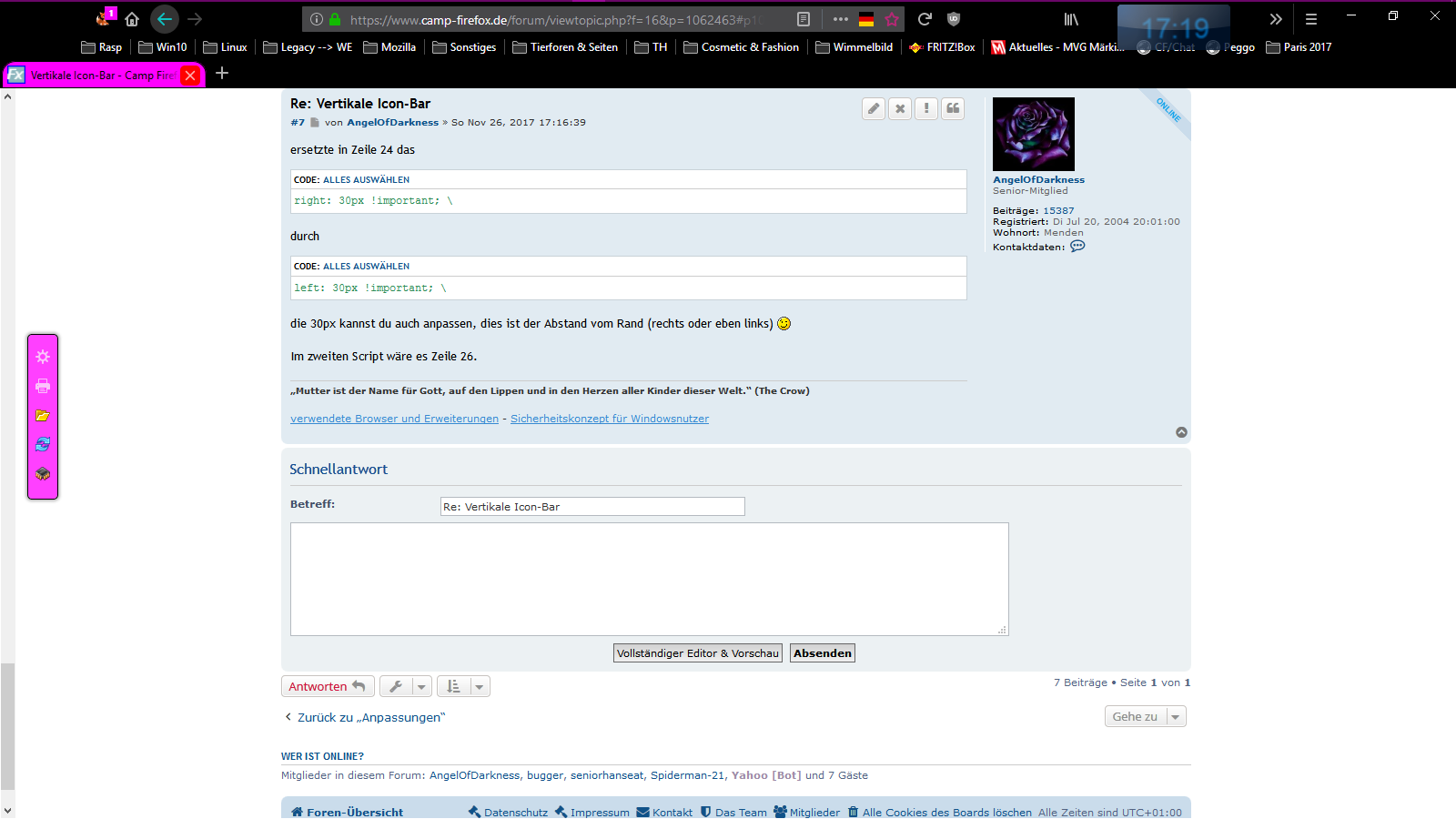 Durch das Füllen der Leiste mit Icons wird die Höhe der Leiste vergrössert und sie sitzt nicht mehr mittig. Auch das habe ich mit einer onResize-Funktion zu korrigieren versucht, doch auch erfolglos. Wahrscheinlich greift die Funktion nicht im "Anpassen"-Modus. Immerhin sitzt nach einem Neustart des Browsers alles wieder mittig.