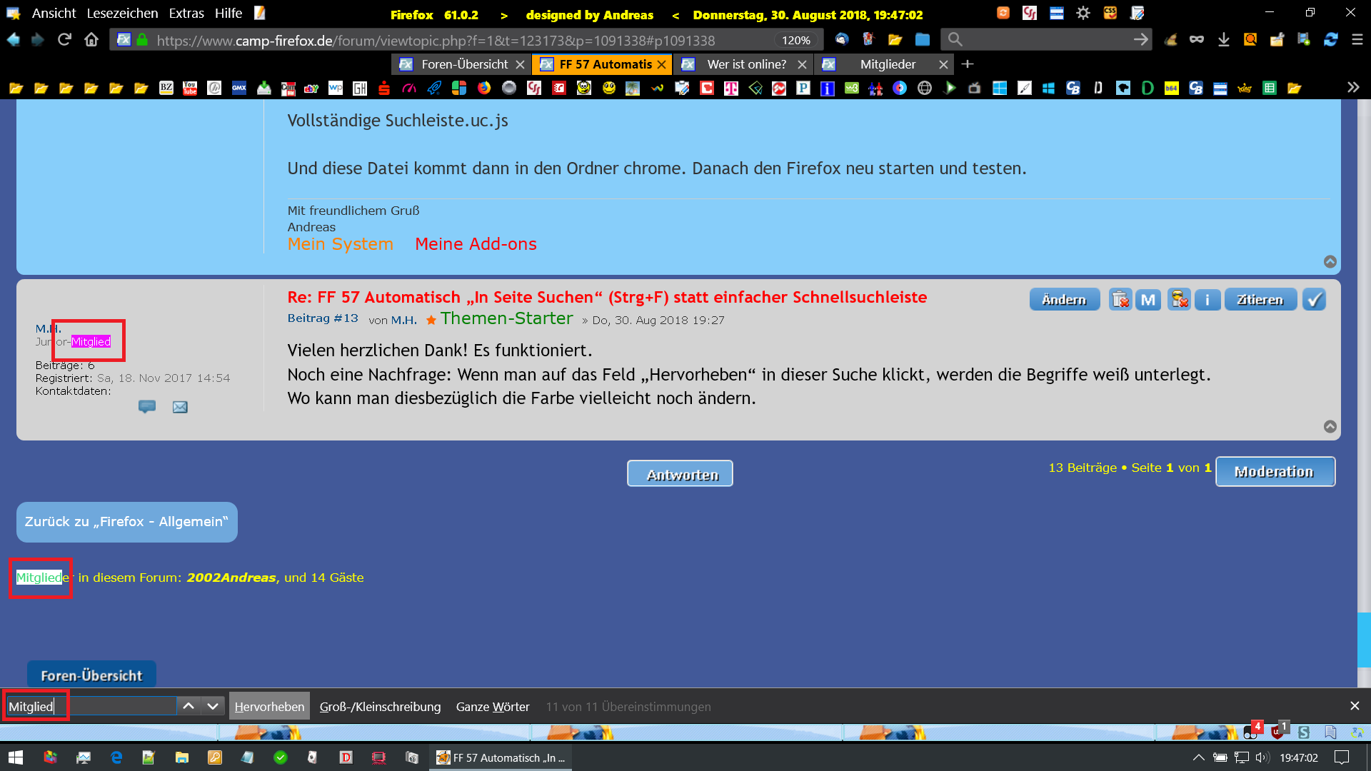 Auf meinen Beitrag habe ich leider bislang keine Antwort erhalten, deshalb hier noch einmal meine Anfrage (natürlich zur aktuellen FF-Version 61.0.2):