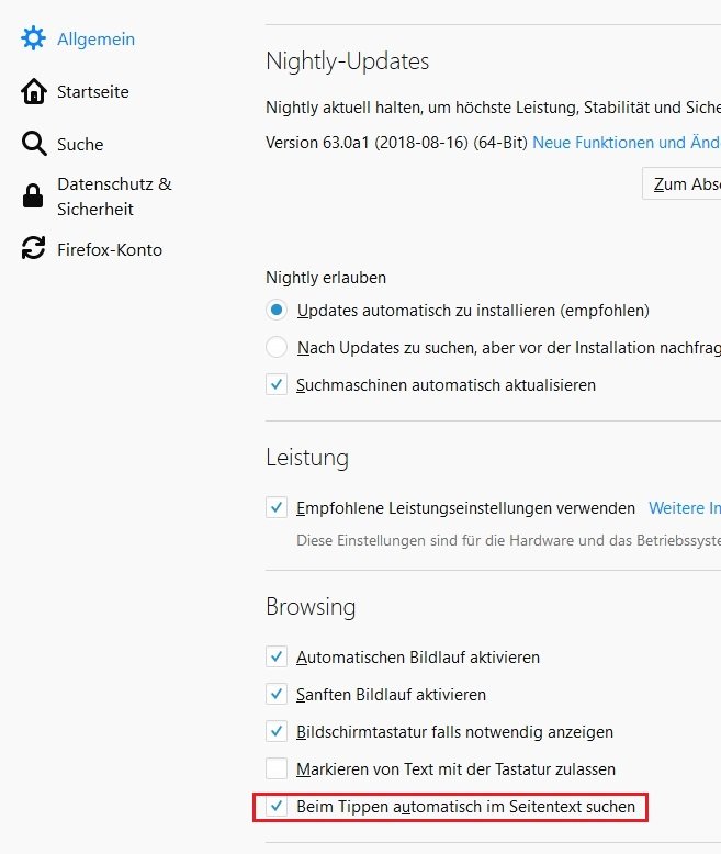 FF Automatisch „In Seite Suchen“ (Strg+F) statt einfacher Schnellsuchleiste