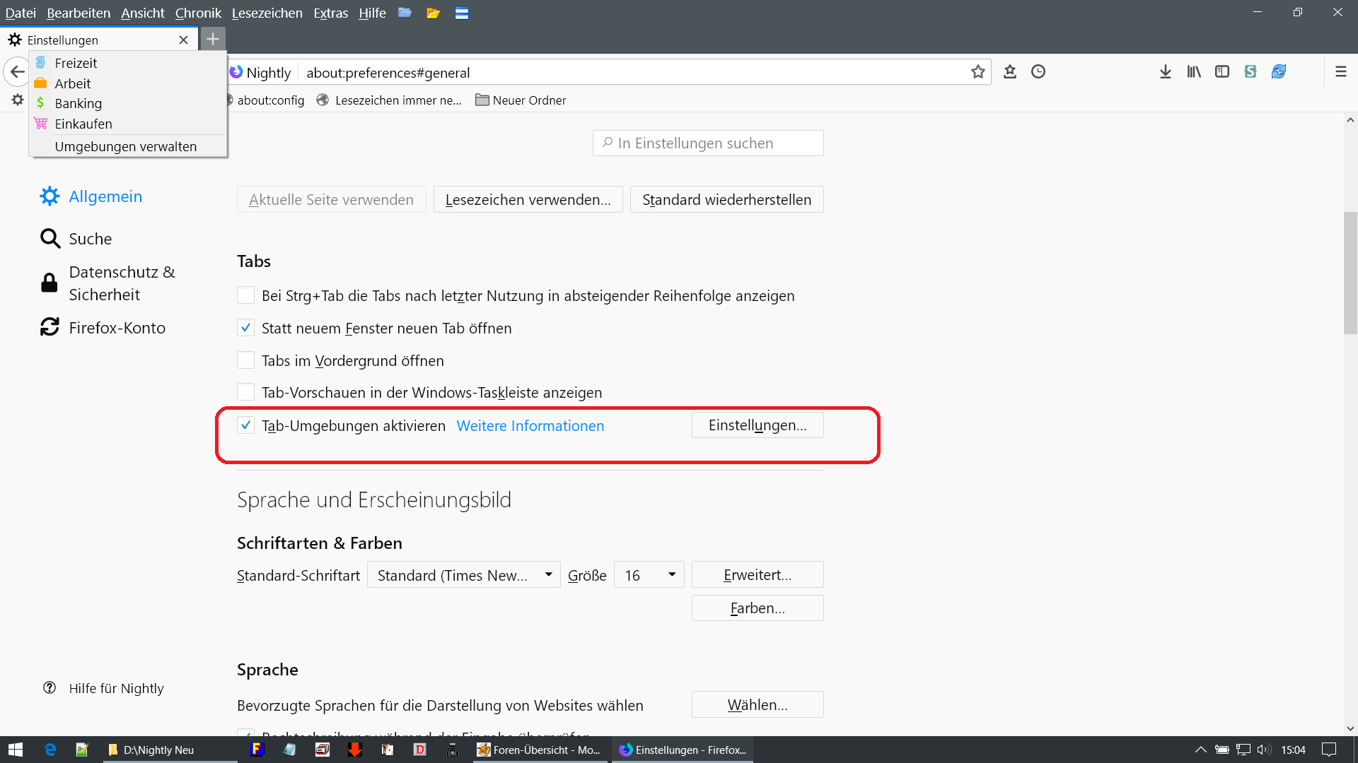 Obwohl ich die deutsche Version habe, aber für "Link in neuem Tab in Umgebung öffnen" hab ich noch nichts gefunden.