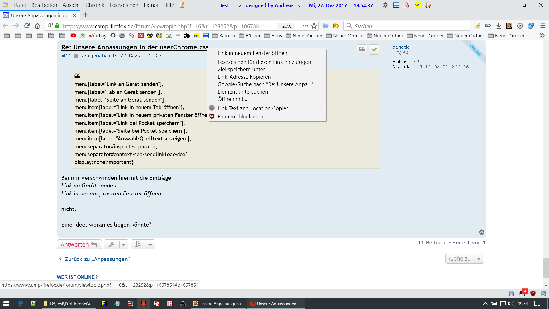 Welche Version nutzt du von Firefox, du hast die Einträge mit "Link in neuem Tab in Umgebung öffen ->" garnicht und dabei hast du den Befehl zum ausblenden garnicht mit angegeben auf dem Bild?!