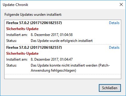 Danke für die Antwort. Die Update Chronik zeigt bei mir das update auf 57.0.1 an. Kein Hinweis auf 57.0.2