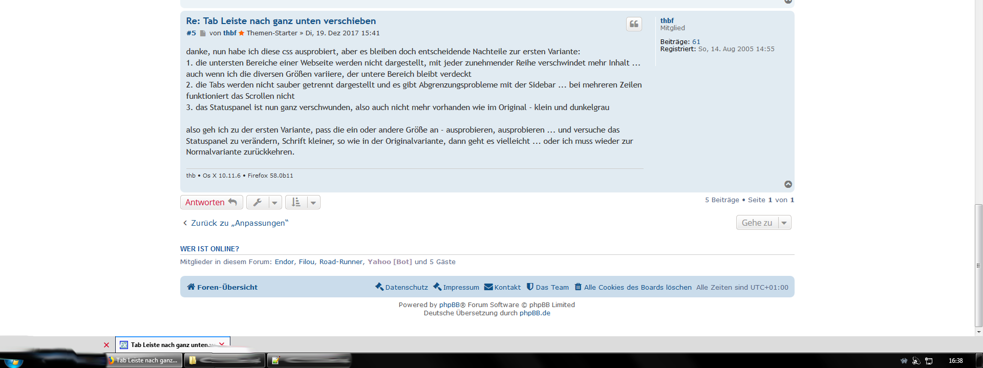 Alles anzeigen@-moz-document url-prefix(chrome://browser/content/browser.xul){ .statuspanel-label{ font-size:15px!important; color:red!important; font-weight:bold; } statuspanel { margin-top: 12px !important } #content-deck{ margin-bottom: 28px !important } #TabsToolbar { margin-bottom: -2px !important; background:lightgrey!important; position:fixed !important; bottom:25px !important; width:100% !important; } #tabbrowser-tabs > tab{ width:250px!important } #alltabs-button{ display:none } .tabbrowser-arrowscrollbox > .arrowscrollbox-scrollbox{ width:1400px!important;} } /*damit die Tableiste nicht 2 zeilig wird wegen dem Button:New Tab*/ .tabbrowser-arrowscrollbox > .arrowscrollbox-scrollbox{ width:1400px!important; }Die Werte kannst/musst du für dich dann noch anpassen.