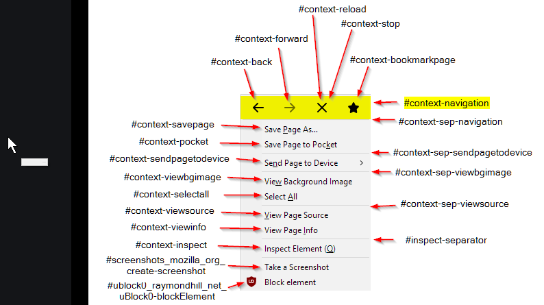 • Alle Einträge wurden im normalen Kontextmenü (Rechtsklickmenü) per CSS-Datei entfernt, ausser einer dünnen Linie (welche im Bild beim Mauszeiger noch zu sehen ist, letzter verbliebener Strich), ich weiß nur nicht wie die heißen könnte. Im Bild fehlt nur noch die letzte Separatorbezeichnung.