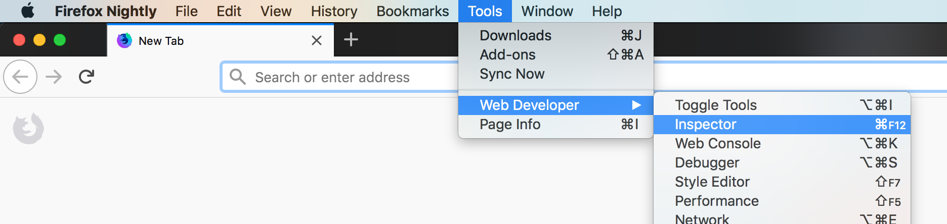 Auf meinem Mac läuft Firefox 57.0.3. Mit dem Shortcut Wahltaste+Befehl+C (Inspektor: Befehlstaste + Alt + C) soll der Inspektor erscheinen. Bei mir erscheint aber das folgende Fenster: