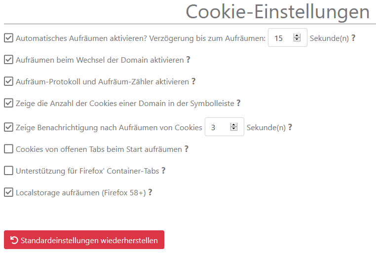 Irgendeine Idee dazu? Wenn diese drei Cookies beim Neustart auch noch weg wären, wär's perfekt.