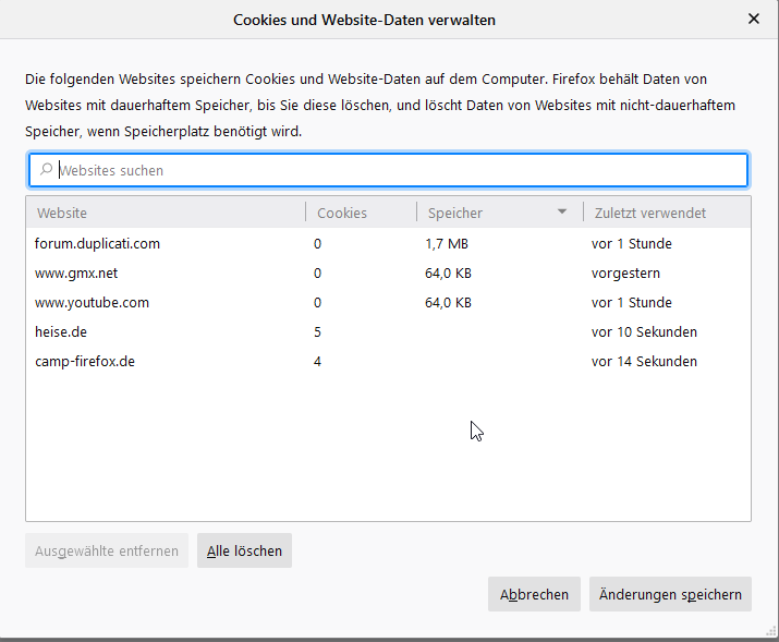Aber warum finde ich dort die duplicati-, gmx- und youtube-Cookies? Diese Seiten wurden schon vor mehreren Browsersitzungen geschlossen und der Browser seitdem etliche Male neu gestartet.