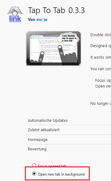 Habe das Add-on Tap to Tab mir installiert.Das soll eigentlich nichts anderes machen als einen Link durch doppelklick in einem neuen Tab laden. Nun kommt es immer wieder vor das wenn ich z.B. bei DuckDuck was eingebe und ich auf die verschiedenen Ergebnisse doppelklicke nicht der Link im neuem Tab geladen wird sondern im aktiven.Ist sehr lästig da man wieder zurück muss und mit der rechten Maustaste "im neuem Tab öffnen" anklicken muss.Hat jemand eine Idee woran das liegen könnte?