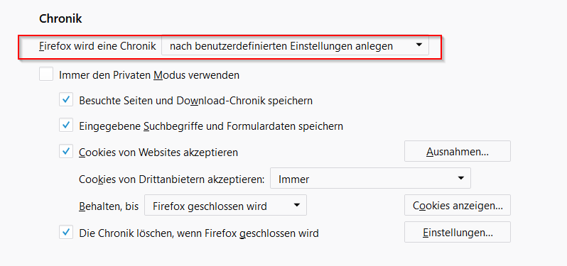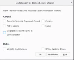 Beim erneuten Start von Firefox (jetzt mit Startseite GOOGLE) sind nur Cookies von GOOGLE zu sehen, obwohl "Browserverlauf beim beenden löschen" KEIN Häkchen hat.