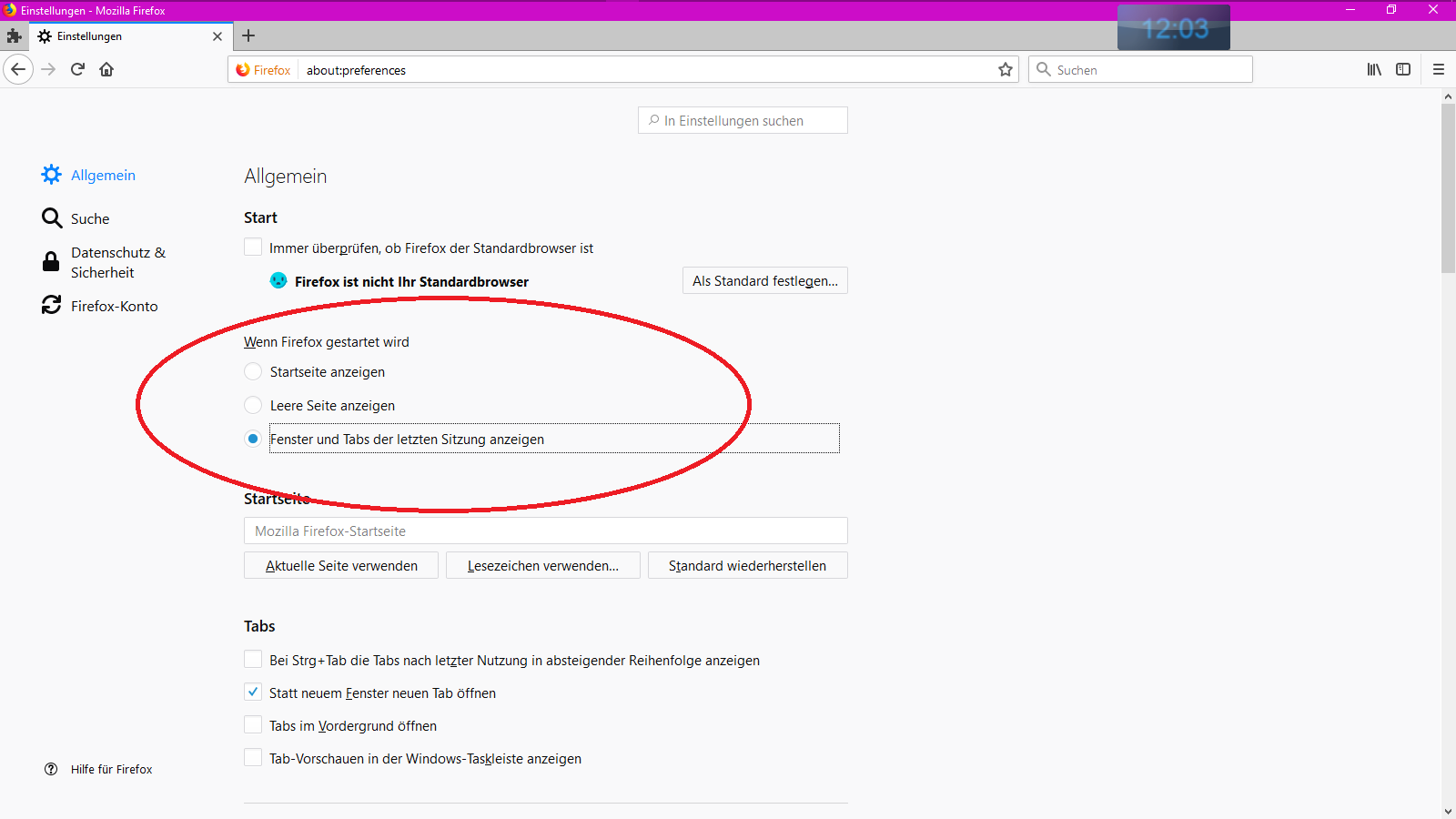 2. Es gab we iterhin eine Zeit, da hat der Firefox, wenn mann in den Einstellungen entsprechend eingestellt hatte, nach der Beendigung und bei der nächsten Öffnung alle vorher bestehenden Tabs anzeigte. Alternativ klam manches Mal die Meldung, dass das nicht hätte passieren dürfen und die Frage, ob die Tabs der letzten Sitzung wieder angezeigt werden sollen. Selbstverständlich sollen sie das, sonst hätte ich sie ja vorher geschlossen. Heute morgen das gleiche Spiel und das noch schlimmer. Nehmen wir an, ich habe 5 Tabs geöffnet und schliesse Firefox. Beim nächsten mal Öffnen erscheint ein einziges Täbchen, sonst nix. Ein Klick auf "Kürzlich geschlossen Tabs oder" -Fenster" geht nicht.